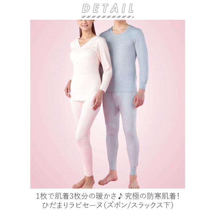 ・1枚で肌着3枚分の暖かさ♪3重構造身頃で保温力バツグン!確かな機能性と驚きの保温力!速乾性、透湿性に優れたひだまりダンロン(R)を使用!究極の防寒肌着!ひだまりラビセーヌ。(ズボン/スラックス下)
