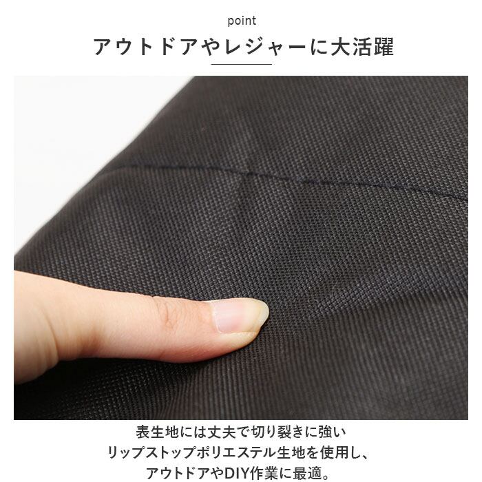 ・表生地には丈夫で切り裂きに強いリップストップポリエステル生地を使用し、アウトドアやDIY作業に最適。