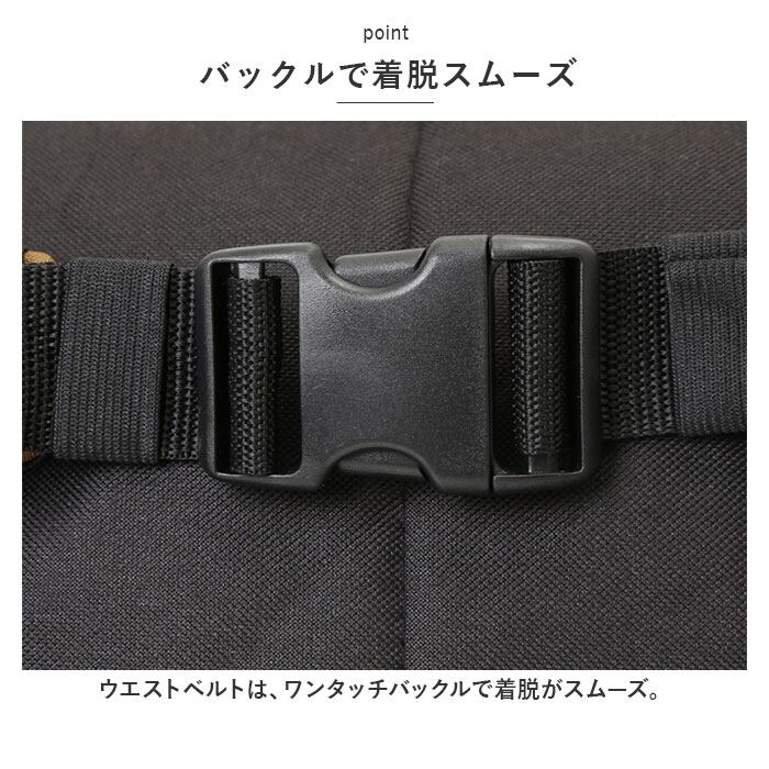 ・ウエストベルトは、ワンタッチバックルで着脱がスムーズ。