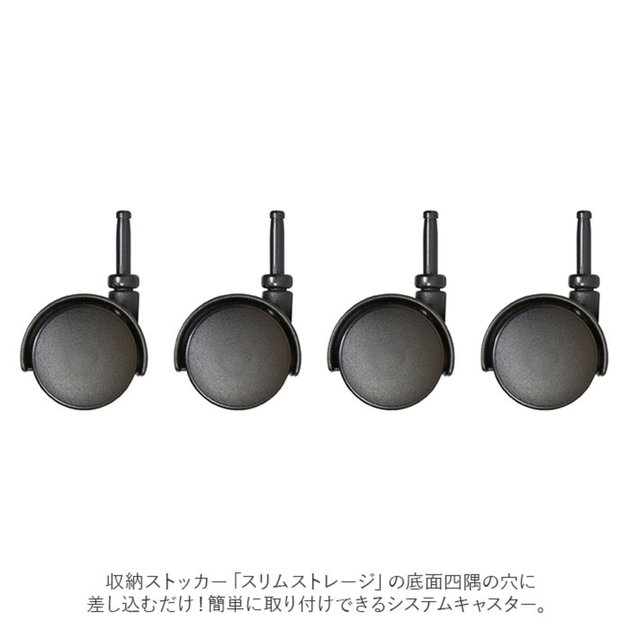 ・収納ストッカー「スリムストレージ」の底面四隅の穴に差し込むだけ!簡単に取り付けできるシステムキャスター。