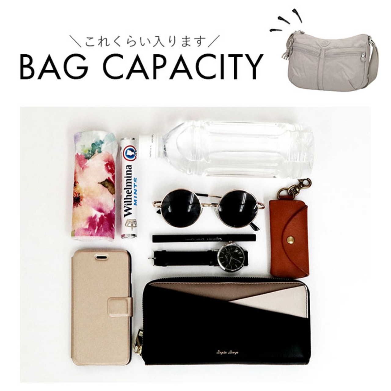 ・メイン収納は500mlのペットボトル、お財布、スマホとお出かけに必要な物が入るサイズ感。