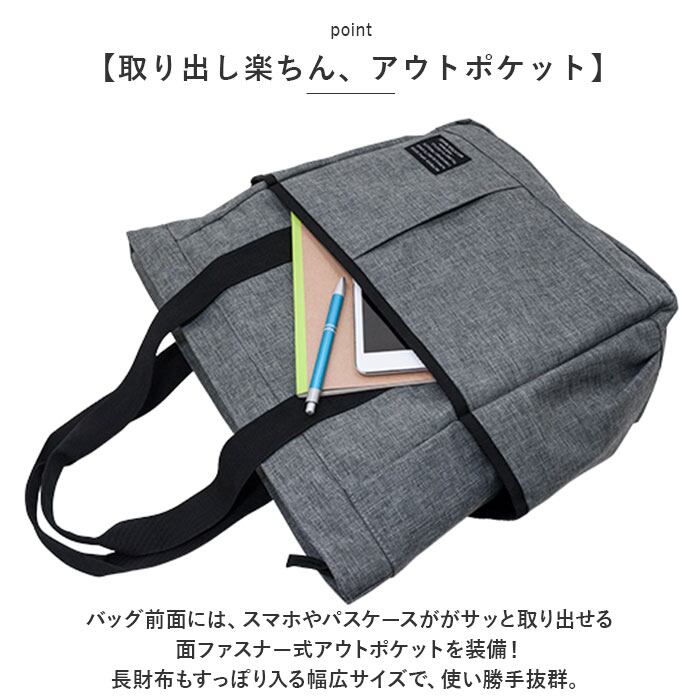 ・バッグ前面には、スマホやパスケースががサッと取り出せる面ファスナー式アウトポケットを装備!長財布もすっぽり入る幅広サイズで、使い勝手抜群。