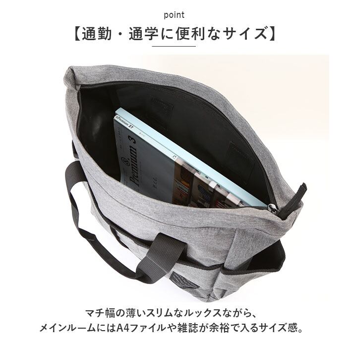 ・マチ幅の薄いスリムなルックスながら、メインルームにはA4ファイルや雑誌が余裕で入るサイズ感。タウンユースはもちろん、通勤通学用トートにオススメ。