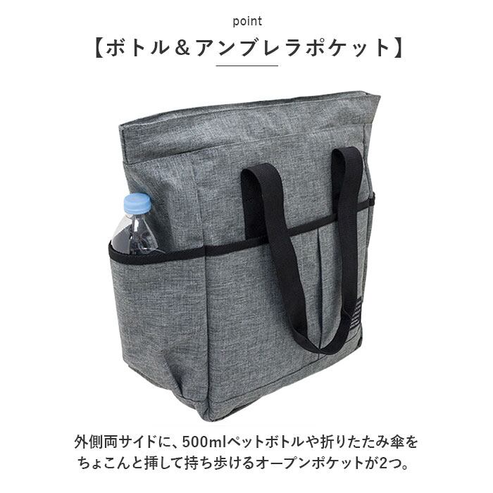 ・外側両サイドに、500mlペットボトルや折りたたみ傘をちょこんと挿して持ち歩けるオープンポケットが2つ。
