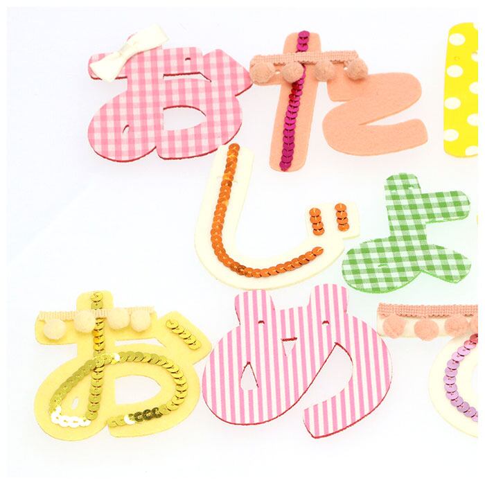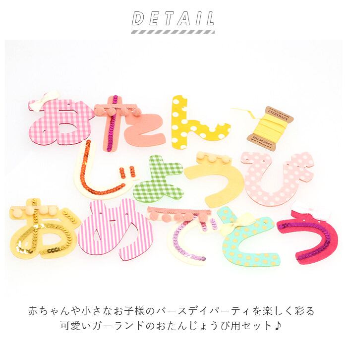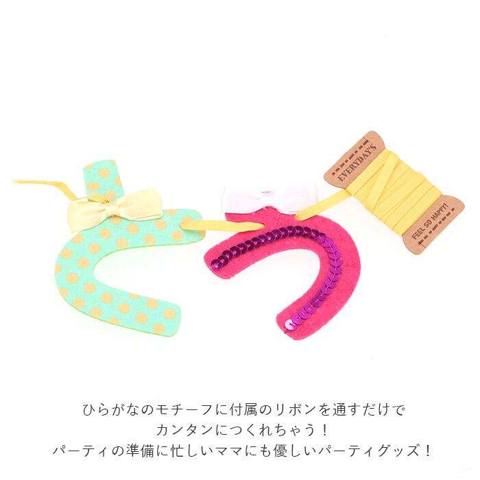 ・ひらがなのモチーフに、付属のリボンを通すだけでカンタンにつくれちゃう!パーティの準備に忙しいママにも優しいパーティグッズ!
