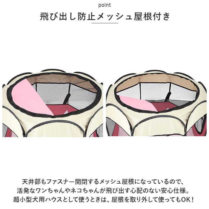 ・天井部もファスナー開閉するメッシュ屋根になっているので、活発なワンちゃんやネコちゃんが飛び出す心配のない安心仕様。超小型犬用ハウスとして使うときは、屋根を取り外して使ってもOK!