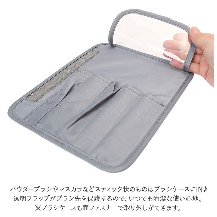 ・パウダーブラシやリップライナー、マスカラなどスティック状のものはブラシケースにIN♪透明フラップがブラシ先を保護するので、いつでも清潔な使い心地。(※ブラシケースも面ファスナーで取り外しができます。)