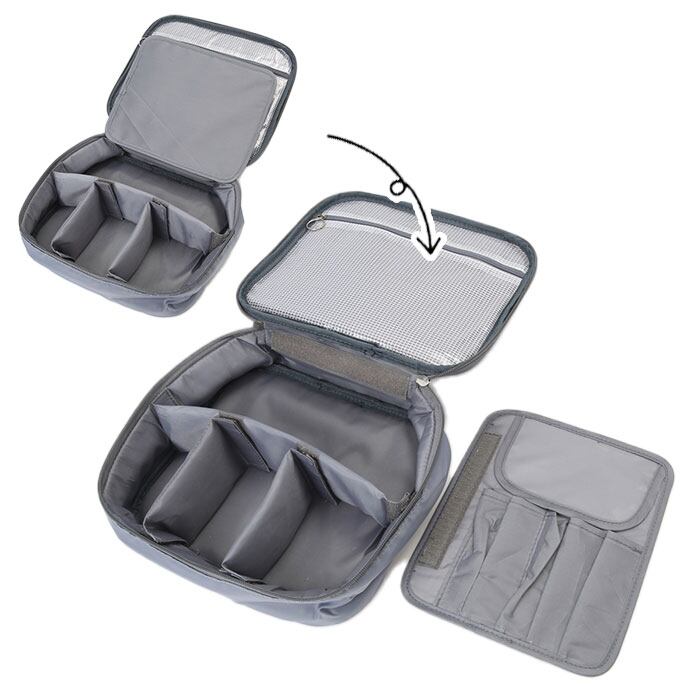 ・ポーチ内のメイン収納部は、取り外しのできる面ファスナー式の仕切りで収納したいメイクツールの大きさに合わせて自分仕様にカスタマイズが可能♪