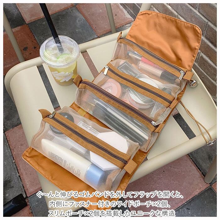 4つの小さなポーチは、トラベルポーチ本体から面ファスナーで切り離すことができ、それぞれ単体のコスメポーチとしても使用可能。