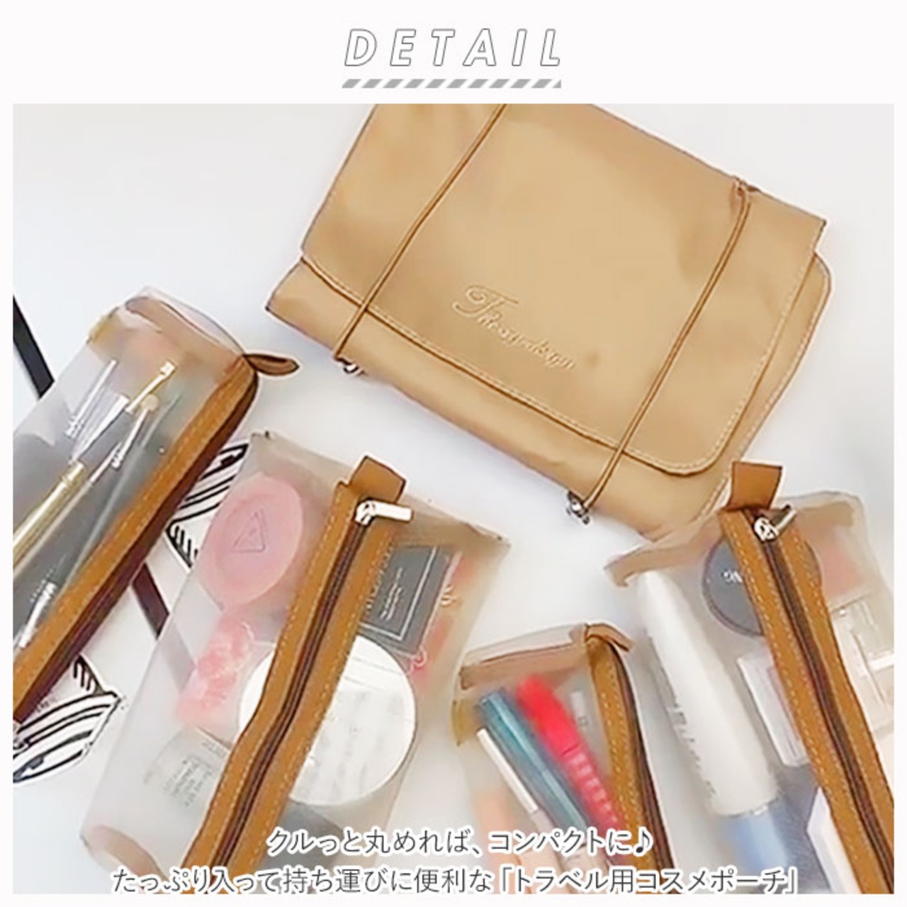 ・クルっと丸めれば、コンパクトに♪たっぷり入って持ち運びに便利な「トラベル用コスメポーチ」