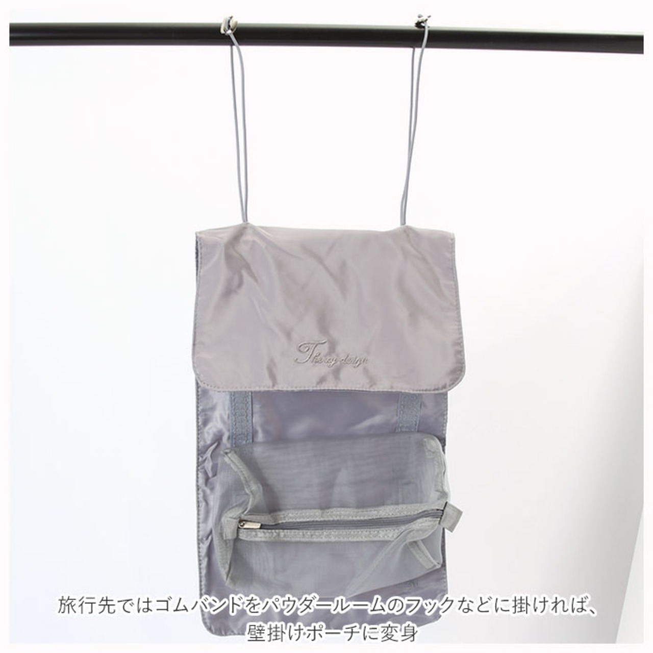 ・旅行先ではゴムバンドをパウダールームのフックなどに掛ければ、壁掛けポーチに変身。