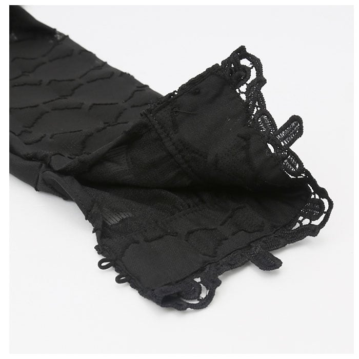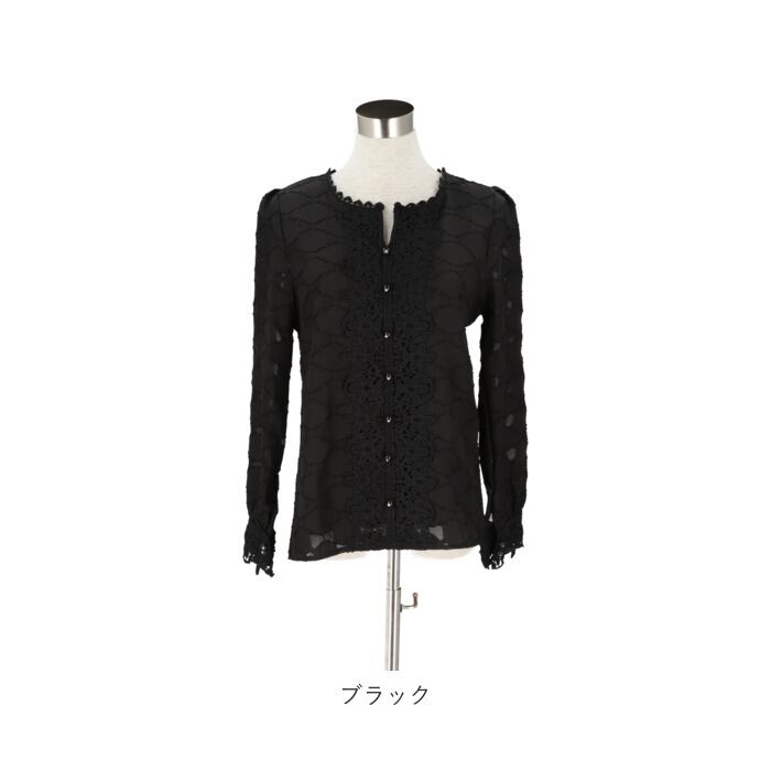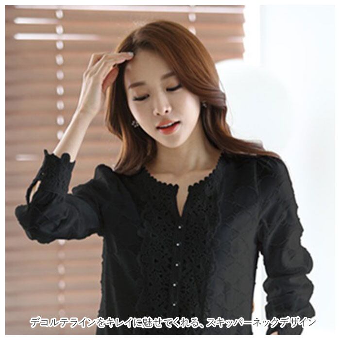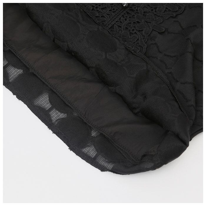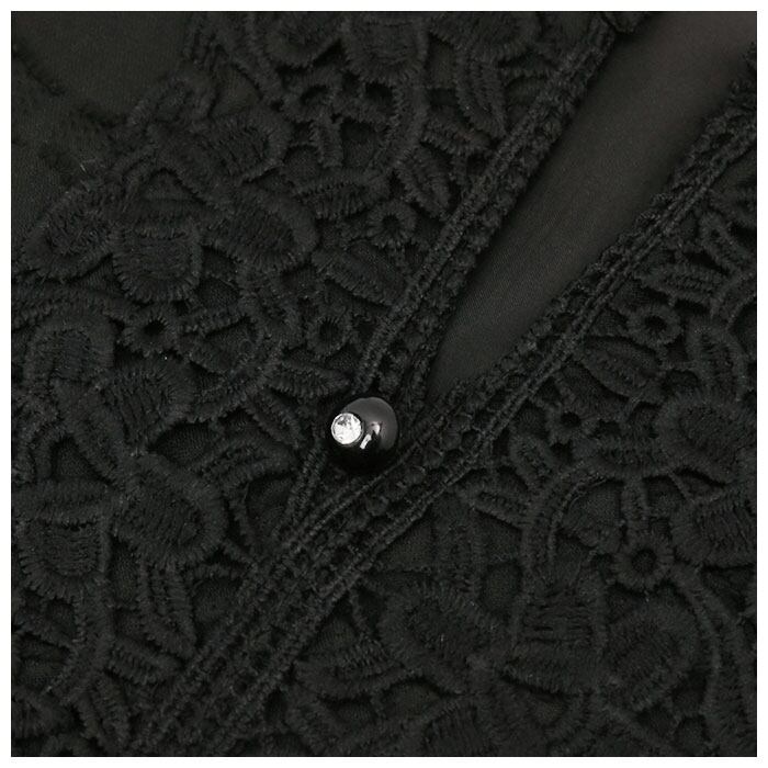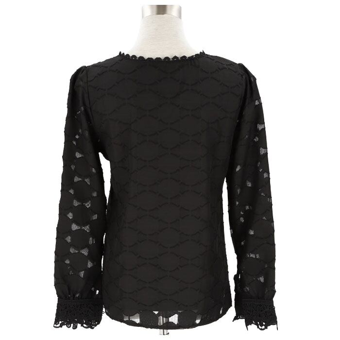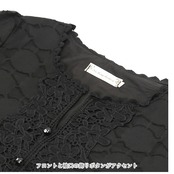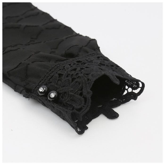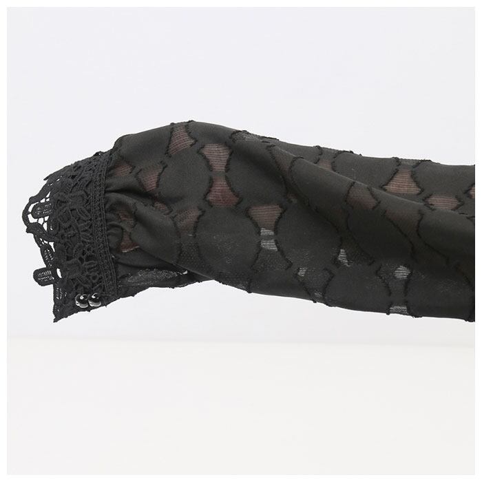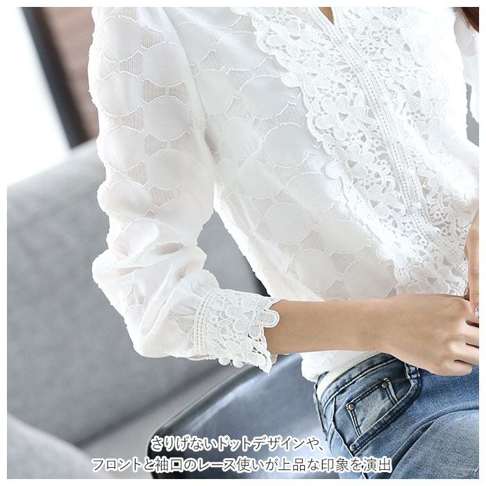 ・さりげないドットデザインや、フロントと袖口のレース使いが上品な印象を演出。