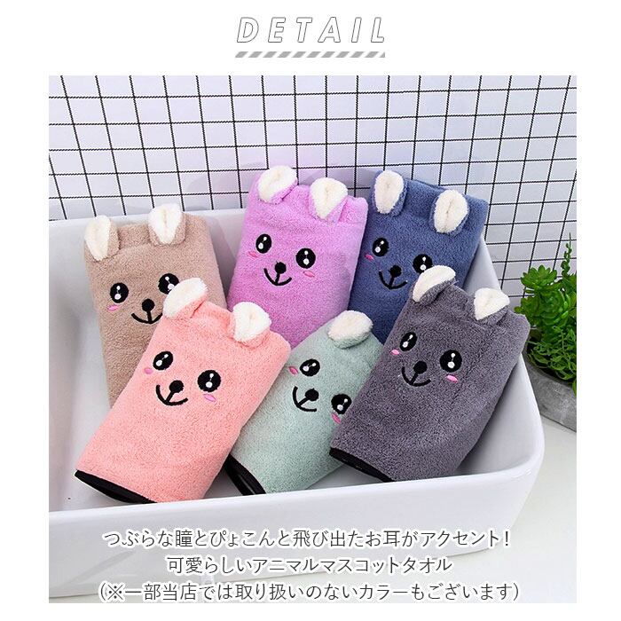 ・つぶらな瞳とぴょこんと飛び出たお耳がアクセント!可愛らしいアニマルマスコットタオル。
