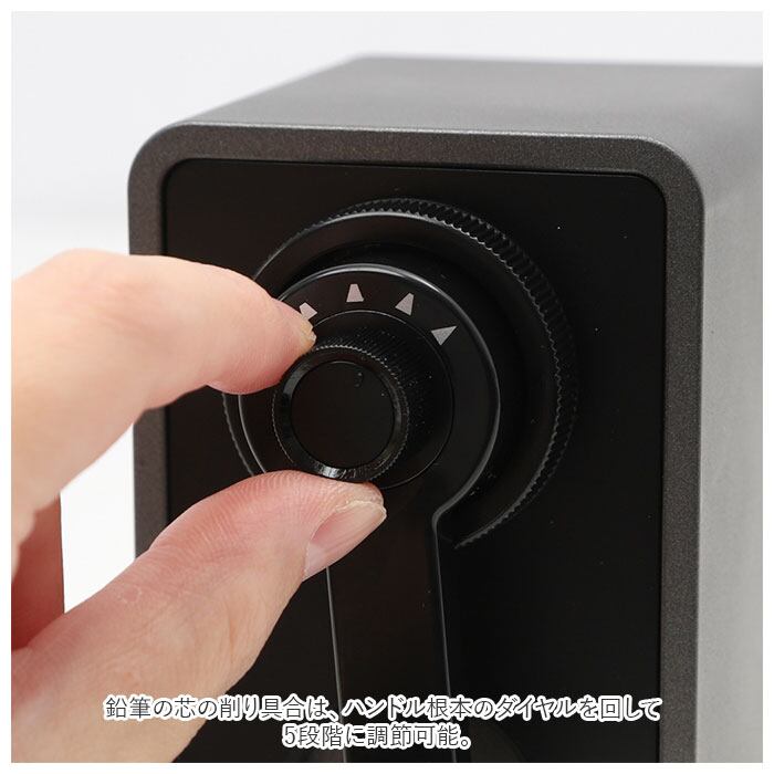 ・鉛筆の芯の削り具合は、ハンドル根本のダイヤルを回して5段階に調節可能。勉強用の鉛筆やスケッチ用のカラーペンシルのお手入れもこれひとつで!(※直径6.5mm〜8mmまでの鉛筆に対応)