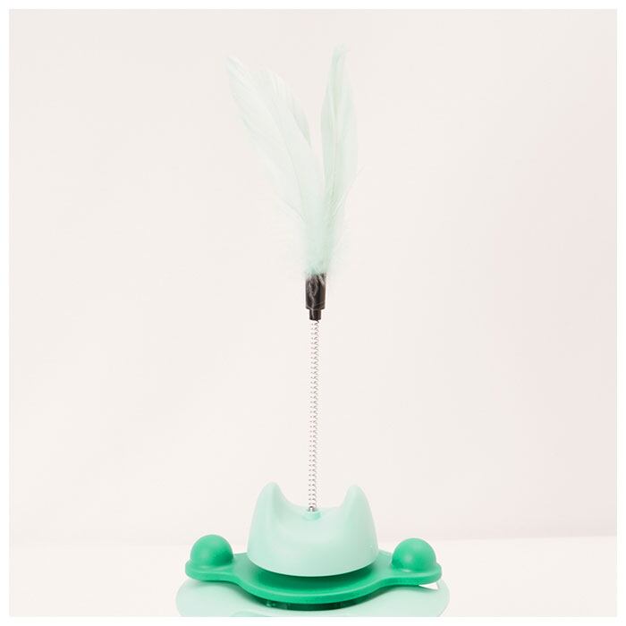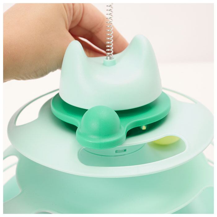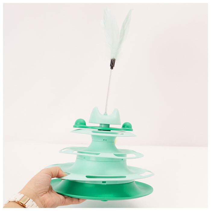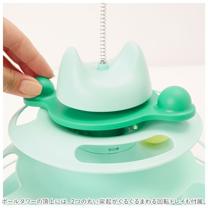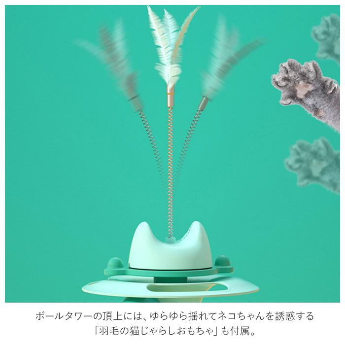 ・ボールタワーの頂上には、2つの丸い突起がぐるぐるまわる回転トレイと、ゆらゆら揺れてネコちゃんを誘惑する「羽毛の猫じゃらしおもちゃ」も付属。