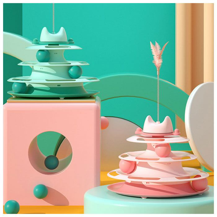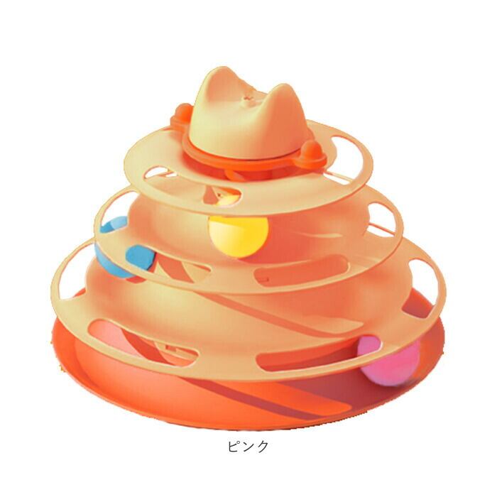 3段のタワーに、レールに挟まったカラフルなボールが3つのシンプル形状。ネコちゃんがボールをツンツン、テシッテシッと叩くたびに、ボールのくるくるが止まらない!