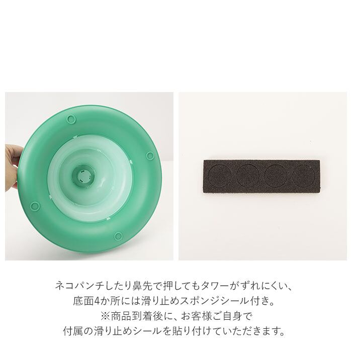 ・ネコパンチしたり鼻先で押してもタワーがずれにくい、底面4か所には滑り止めスポンジシール付き。(※商品到着後に、お客様ご自身で付属の滑り止めシールを貼り付けていただきます。)