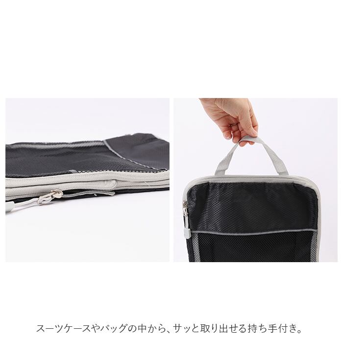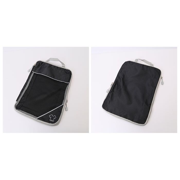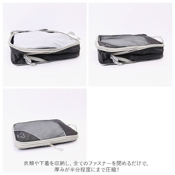 ・衣類や下着を収納し、全てのファスナーを閉めるだけで、厚みが半分程度にまで圧縮!