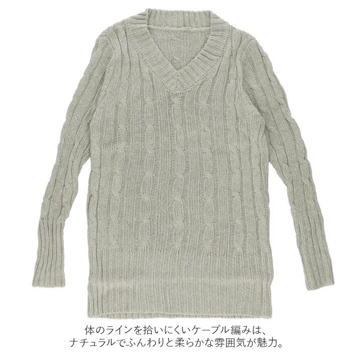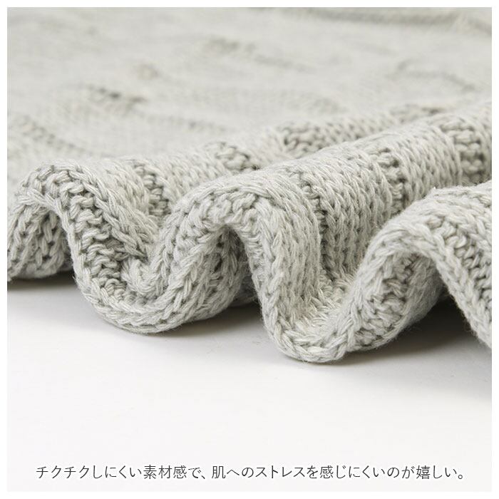 ・体のラインを拾いにくいケーブル編みは、ナチュラルでふんわりと柔らかな雰囲気が魅力。