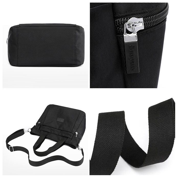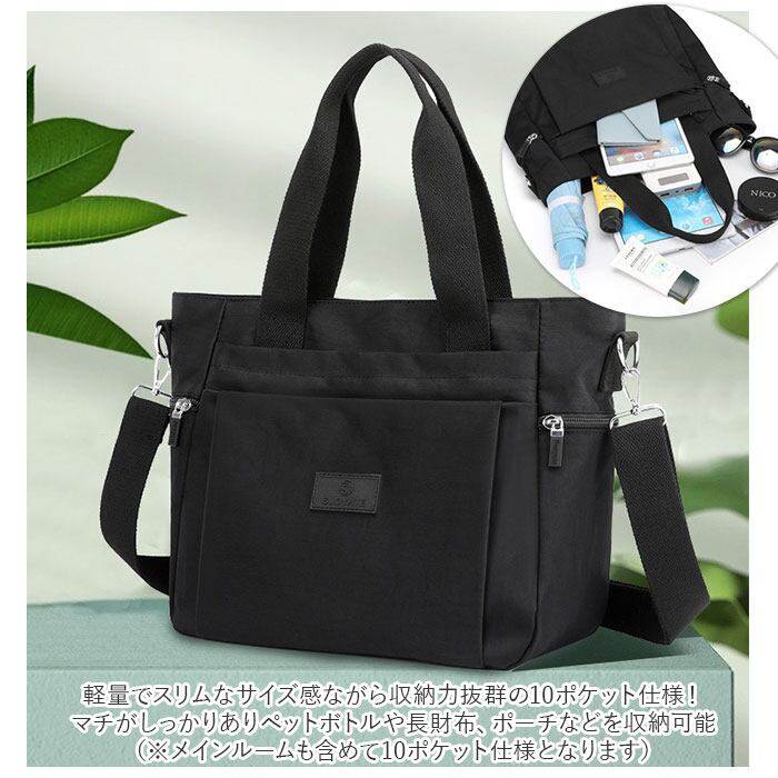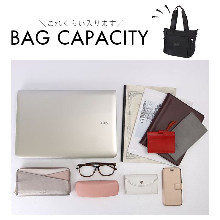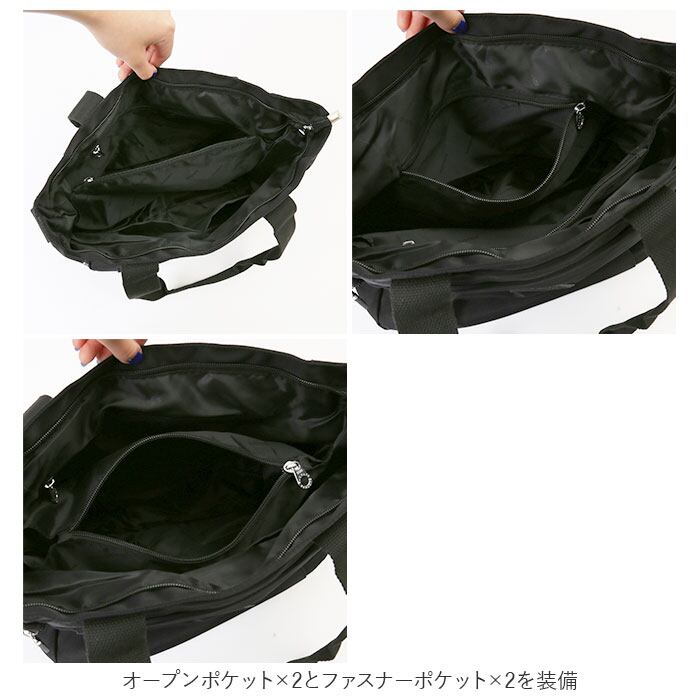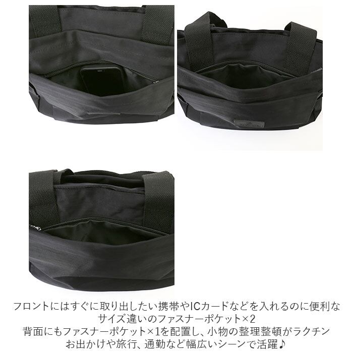 ・メインルームはA4サイズ対応。マチがしっかりありペットボトルや長財布、ポーチなどを収納可能。オープンポケット×2とファスナーポケット×2を装備。