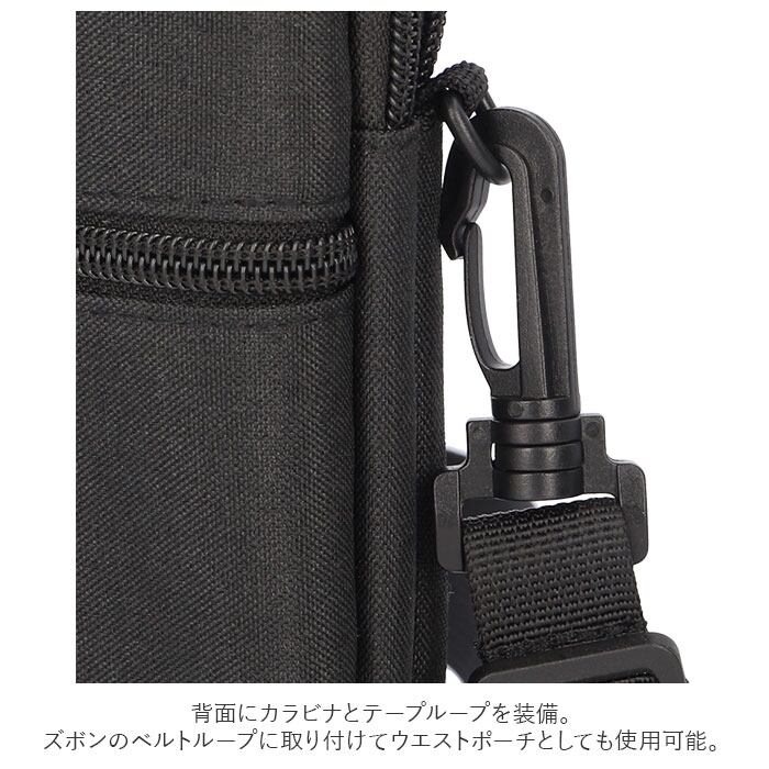 ・背面にカラビナとテープループを装備。ズボンのベルトループに取り付けてウエストポーチとしても使用可能。