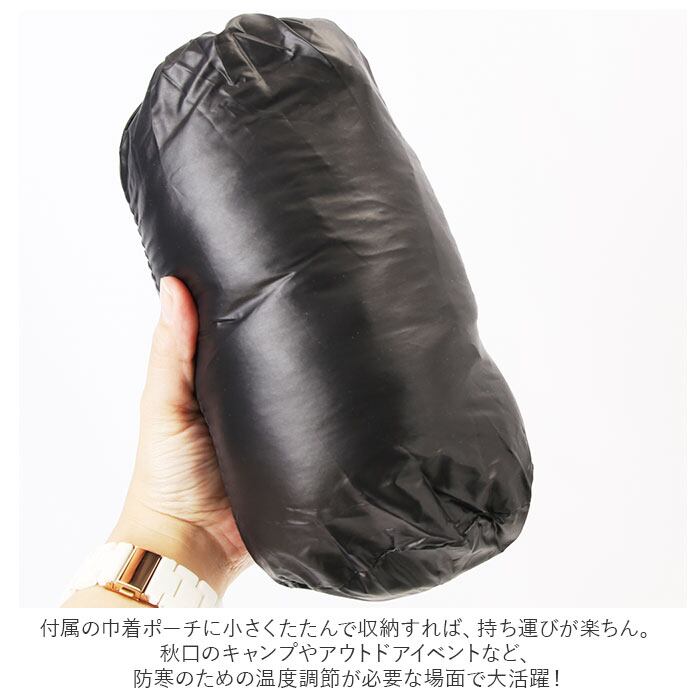 ・付属の巾着ポーチに小さくたたんで収納すれば、持ち運びが楽ちん。秋口のキャンプやアウトドアイベントなど、防寒のための温度調節が必要な場面で大活躍!