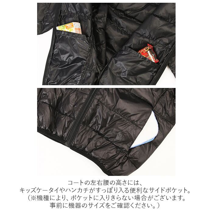 ・コートの左右腰の高さには、キッズケータイやハンカチがすっぽり入る便利なサイドポケット。(※機種により、ポケットに入りきらない場合がございます。事前に機器のサイズをご確認ください。)