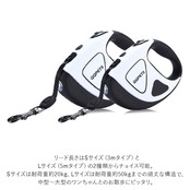 ・リード長さはSサイズ(3mタイプ)とLサイズ(5mタイプ)の2種類からチョイス可能。Sサイズは耐荷重約20kg、Lサイズは耐荷重約50kgまでの頑丈な構造で、中型〜大型のワンちゃんとのお散歩にピッタリ。