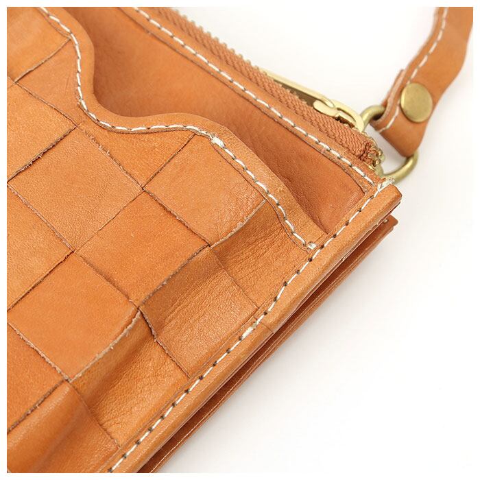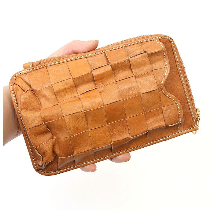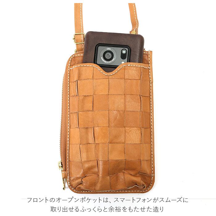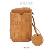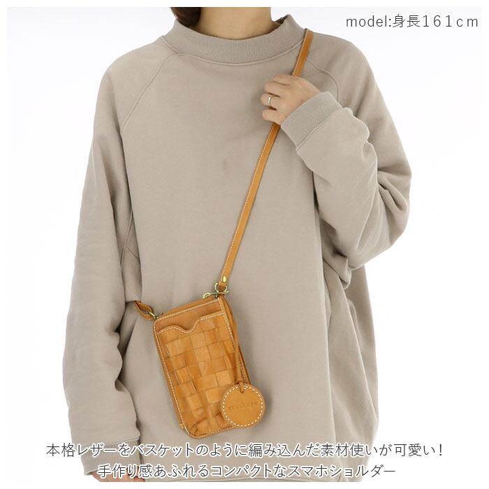 ・本格レザーをバスケットのように編み込んだ素材使いが可愛い!手作り感あふれるコンパクトなスマホショルダー。