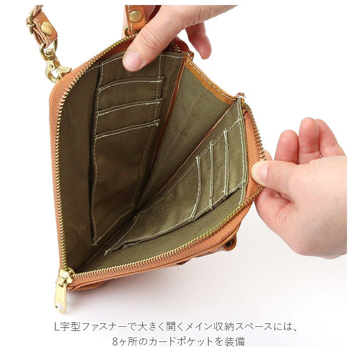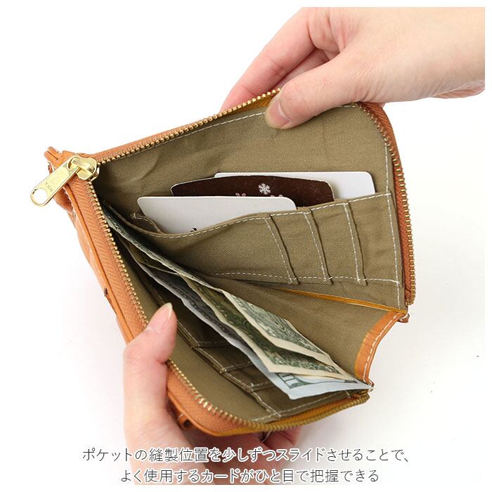 ・L字型ファスナーで大きく開くメイン収納スペースには、8ヶ所のカードポケットを装備。ポケットの縫製位置を少しずつスライドさせることで、よく使用するカードがひと目で把握できる。