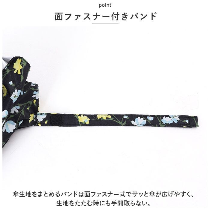 ・傘生地をまとめるバンドは面ファスナー式でサッと傘が広げやすく、生地をたたむ時にも手間取らない。