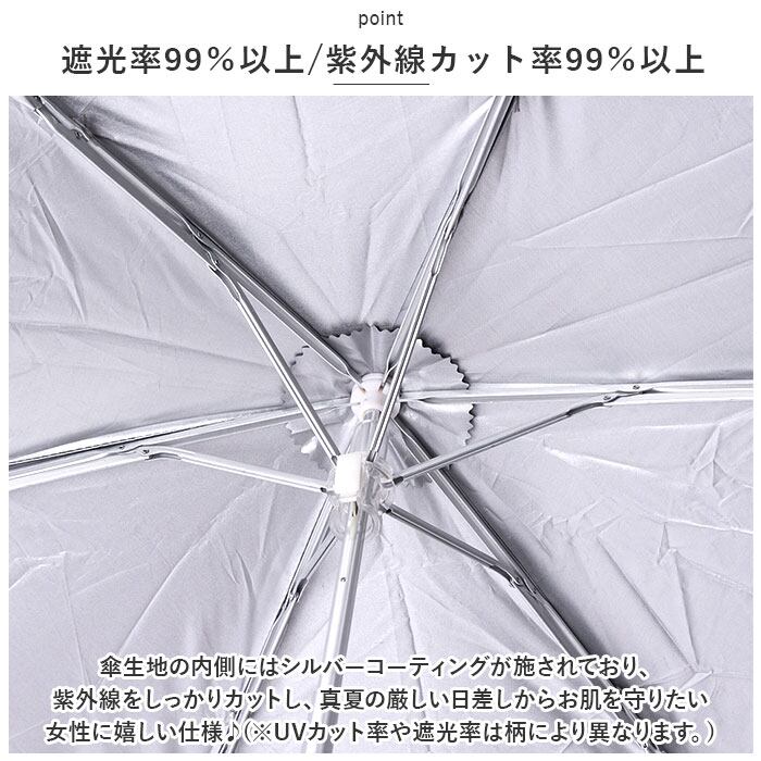 ・傘生地の内側にはシルバーコーティングが施されており、紫外線をしっかりカットし、真夏の厳しい日差しからお肌を守りたい女性に嬉しい仕様♪(※UVカット率や遮光率は柄により異なります。)