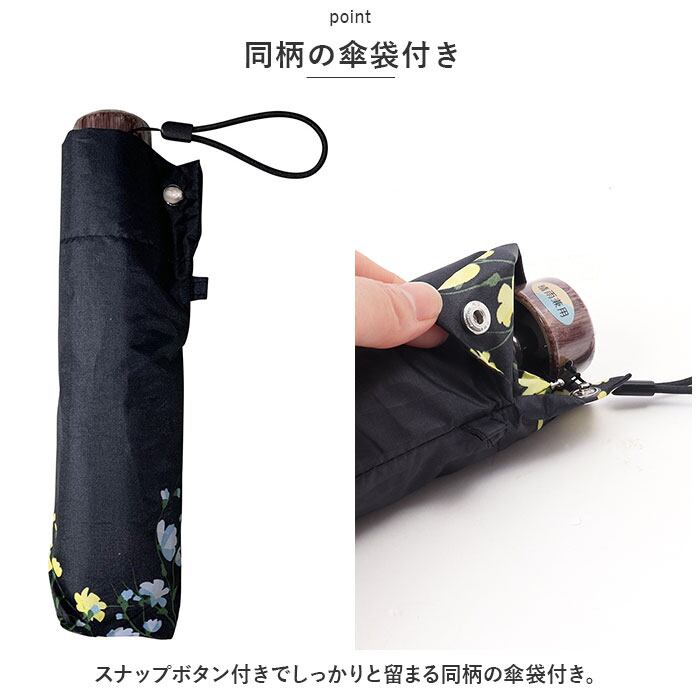 ・スナップボタン付きでしっかりと留まる同柄の傘袋付き。