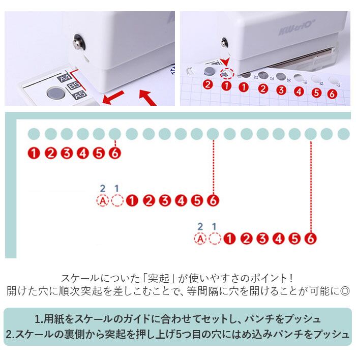 ・穴の位置を迷わずに決められるスケールが付属。(※A5サイズ:20孔、B5サイズ:26孔、A4サイズ:30孔。)