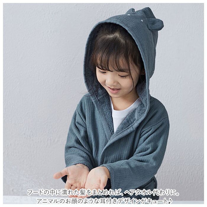 ・フードの中に濡れた髪をまとめれば、ヘアタオル代わりに。アニマルのお顔のような耳付きデザインがキュート♪