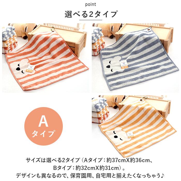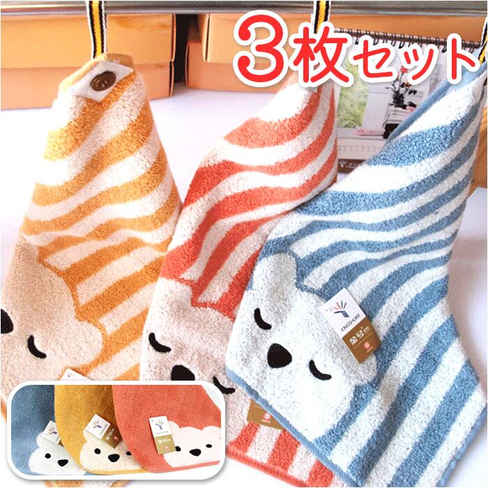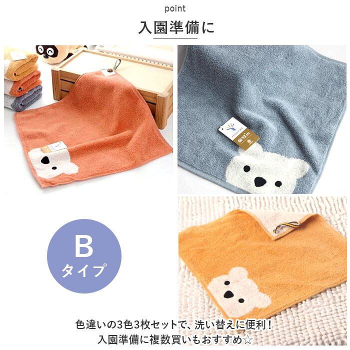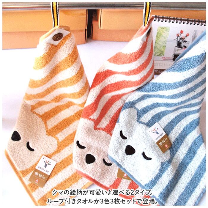 ・クマの絵柄が可愛い♪選べる2タイプ。ループ付きタオルが3色3枚セットで登場。