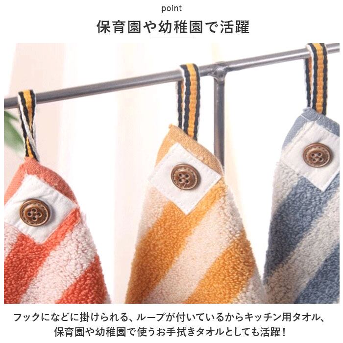 ・フックになどに掛けられる、ループが付いているからキッチン用タオル、保育園や幼稚園で使うお手拭きタオルとしても活躍!