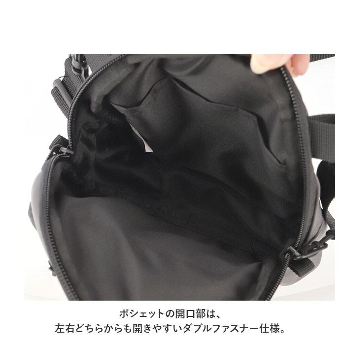 ・ポシェットの開口部は、左右どちらからも開きやすいダブルファスナー仕様。小物がサッと取り出しやすく、外出先でのプライバシー面でも安心なつくり。