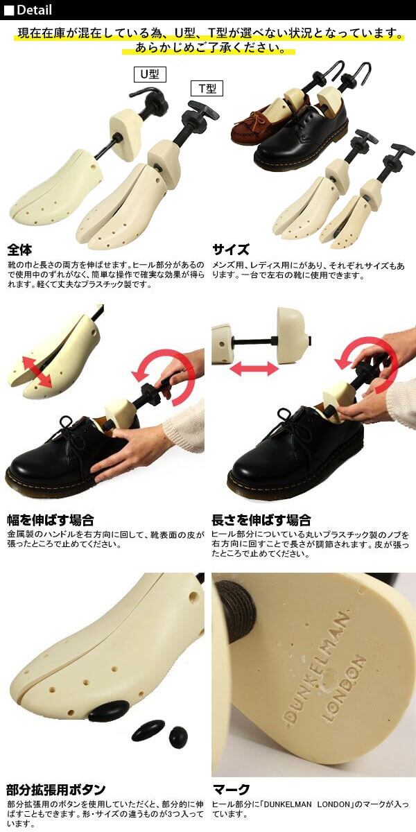 きつい靴を簡単操作で伸ばせるストレッチャーです。靴にセットして、ハンドルを操作するだけで靴の幅と長さを同時に伸ばすことができます。また、付属のボタンを使用すれば指があたる箇所の部分伸ばしもできます。