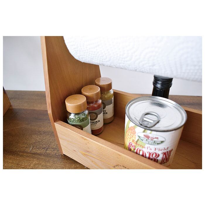 ・幅24cmの一般的なキッチンペーパーと、お気に入りのスパイスやカトラリーなどが収納可能。