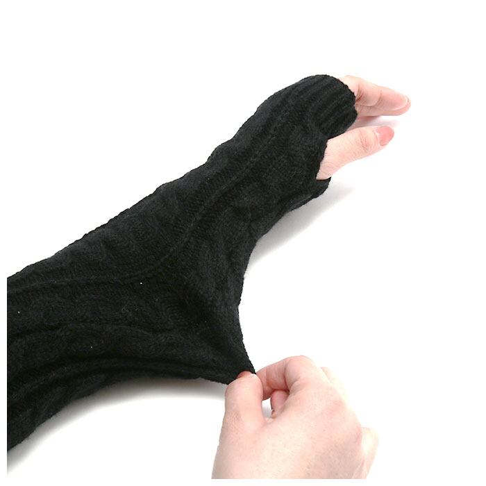 ・ケーブルニット編みデザインがおしゃれなアームウォーマー。指先が出るデザインなので、手全体をあたたかく覆いながら指先を自由に動かせる◎