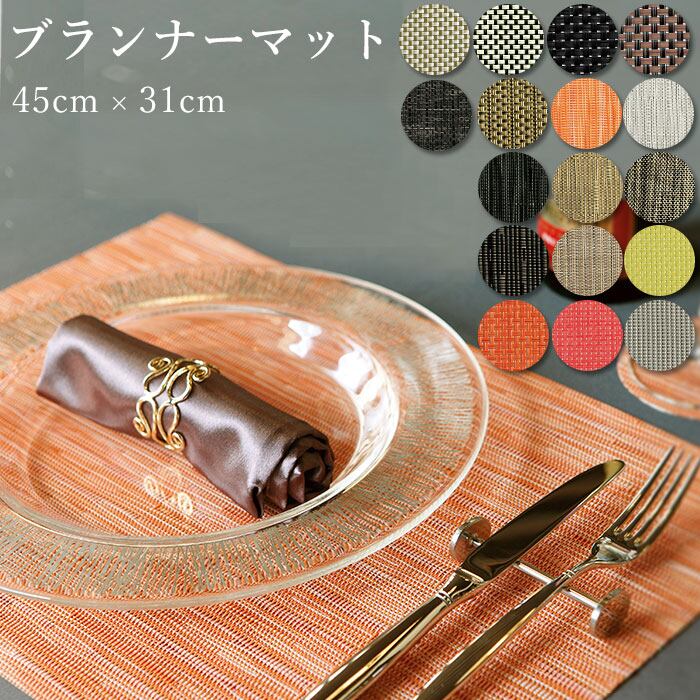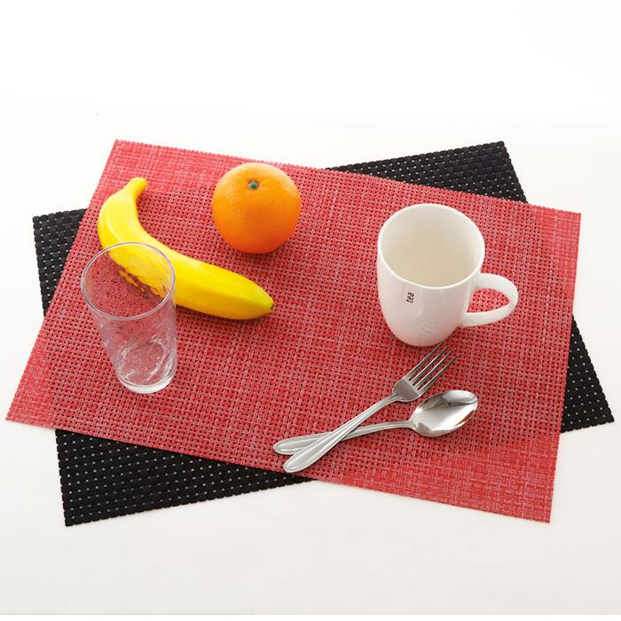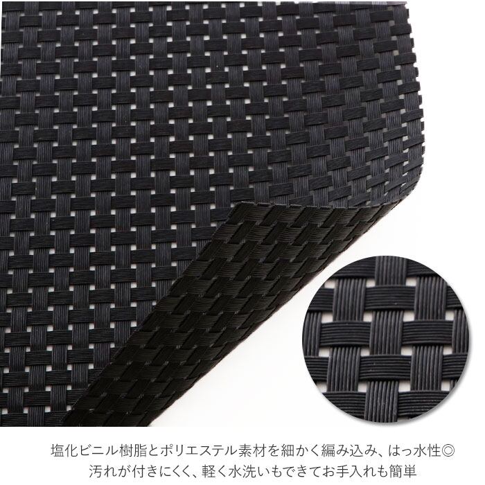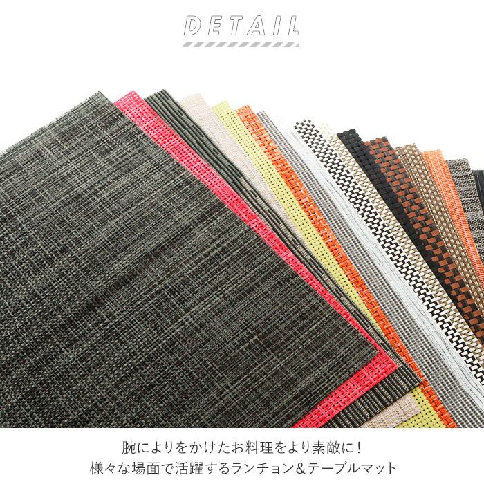 ・塩化ビニル樹脂とポリエステル素材を細かく編み込んだ、はっ水性に優れたマット。汚れが付きにくく、軽い水洗いもできるので、布製のランチョンマットよりお手入れも簡単。