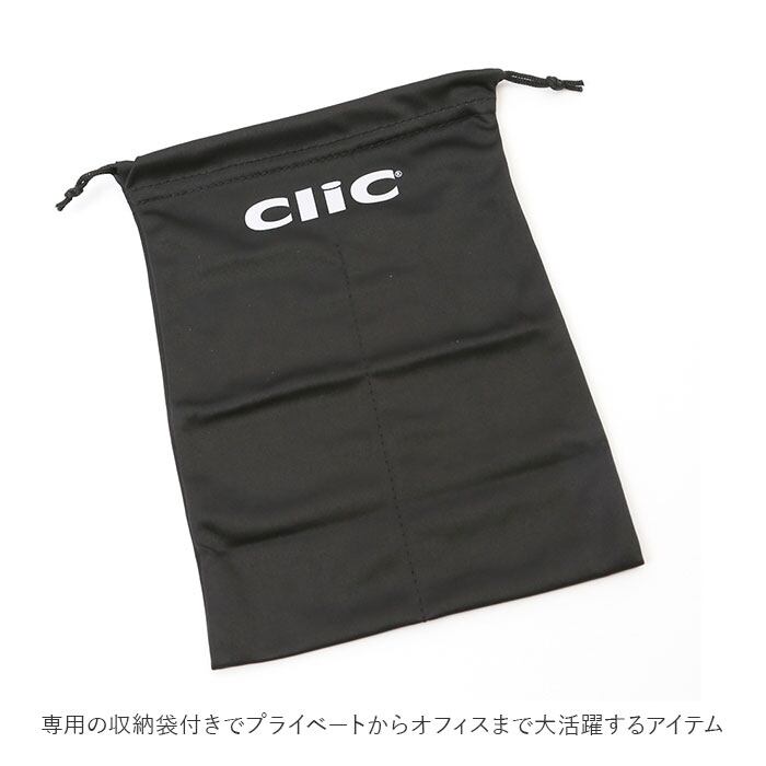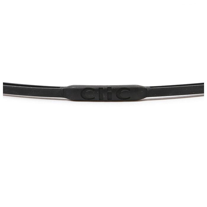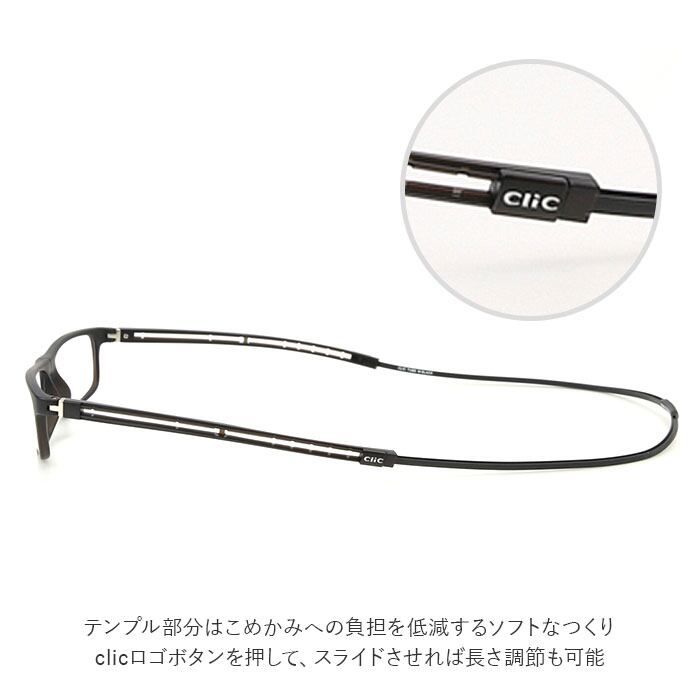 ・テンプル部分はこめかみへの負担を低減するソフトなつくり。clicロゴボタンを押して、スライドさせれば長さ調節も可能。