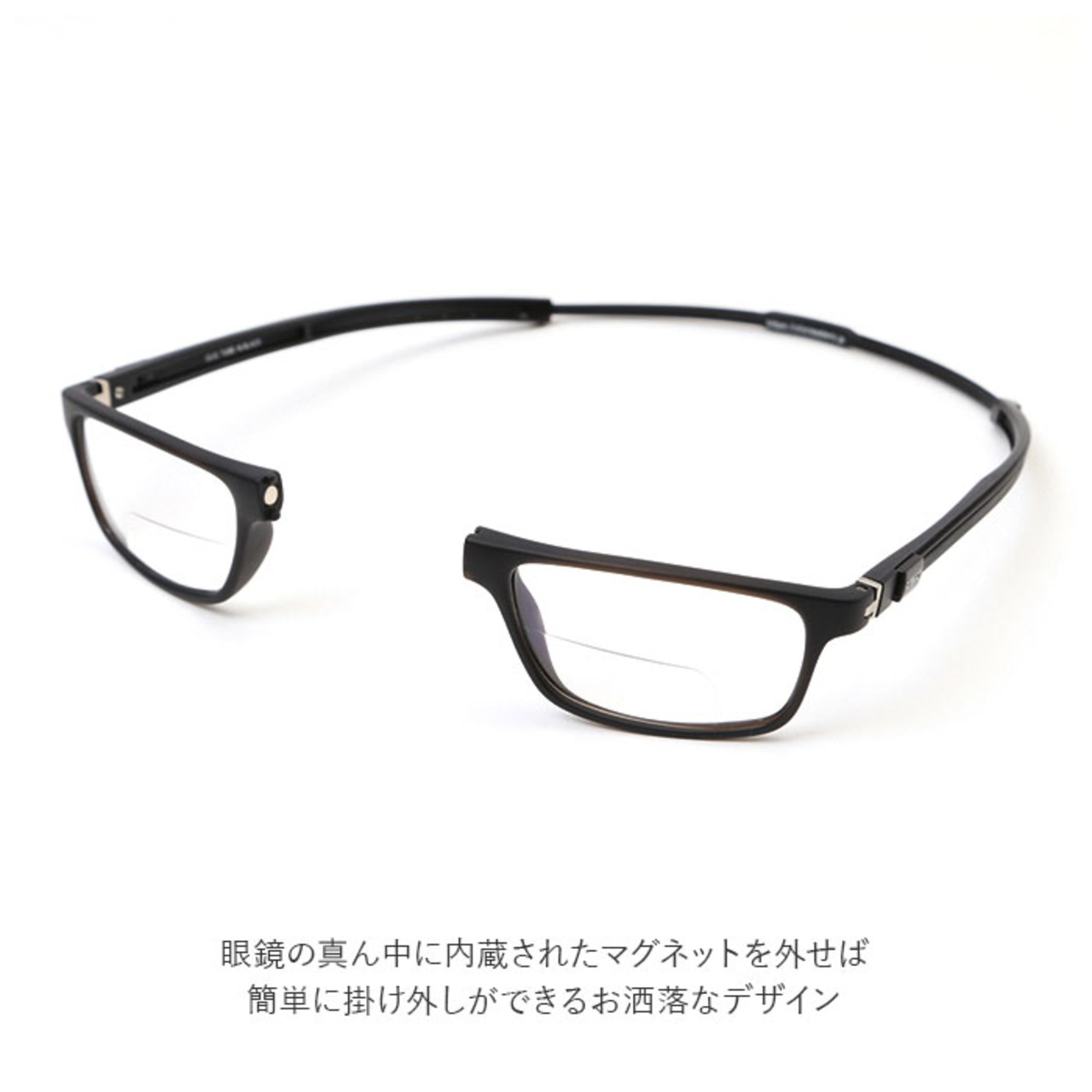 ・眼鏡の真ん中に内蔵されたマグネットを外せば簡単に掛け外しができるお洒落なデザイン。