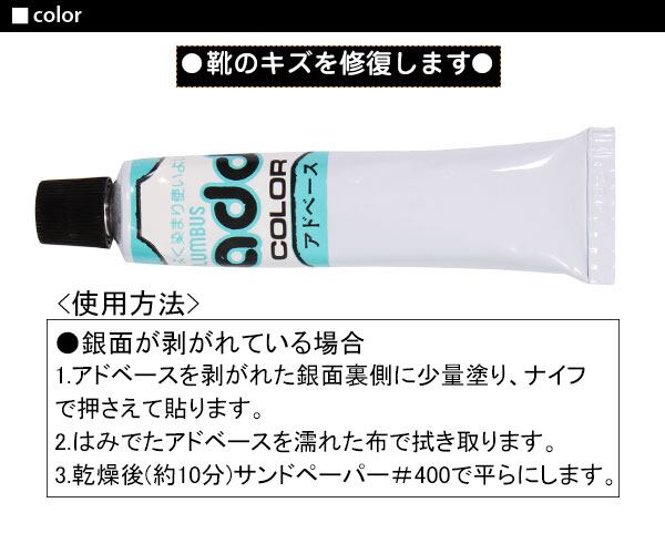 ・靴のキズ埋めをして補修します。深い傷を埋めたり、銀面のキズを埋めるのに適しています♪アドベースの中味の色は白(ホワイト)ですが、他の色のアドカラー同士を混ぜても使用いただけます。