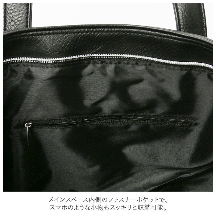 ・メインスペース内側のファスナーポケットで、スマホのような小物もスッキリと収納可能。