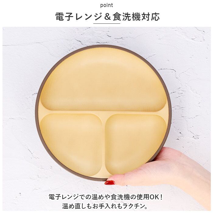 ・樹脂素材にウレタン塗装を施し、汚れや傷がつきにくいプレート。天然木の質感を再現した木目調のデザイン。