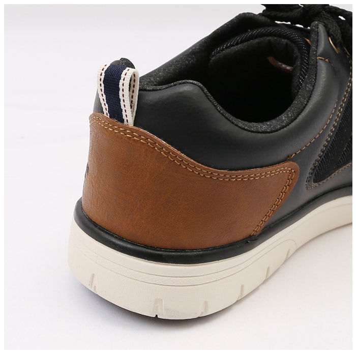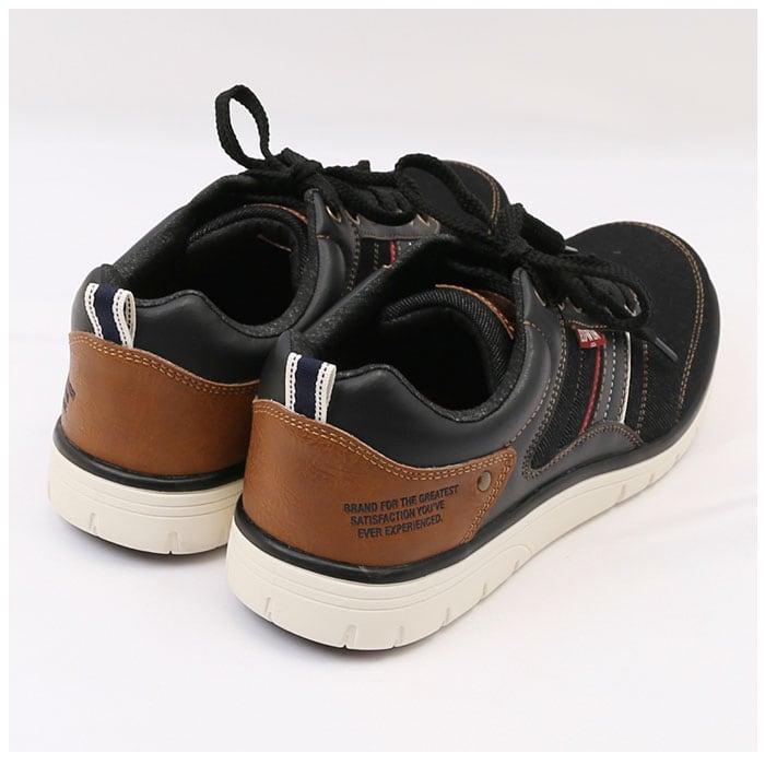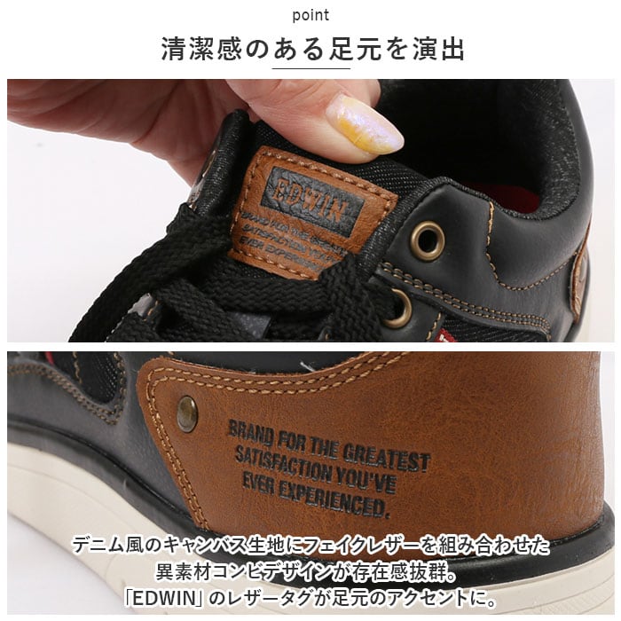 ・デニム風のキャンバス生地にフェイクレザーを組み合わせた異素材コンビデザインが存在感抜群。「EDWIN」のレザータグと赤いピスネームが足元の印象的なアクセントに。