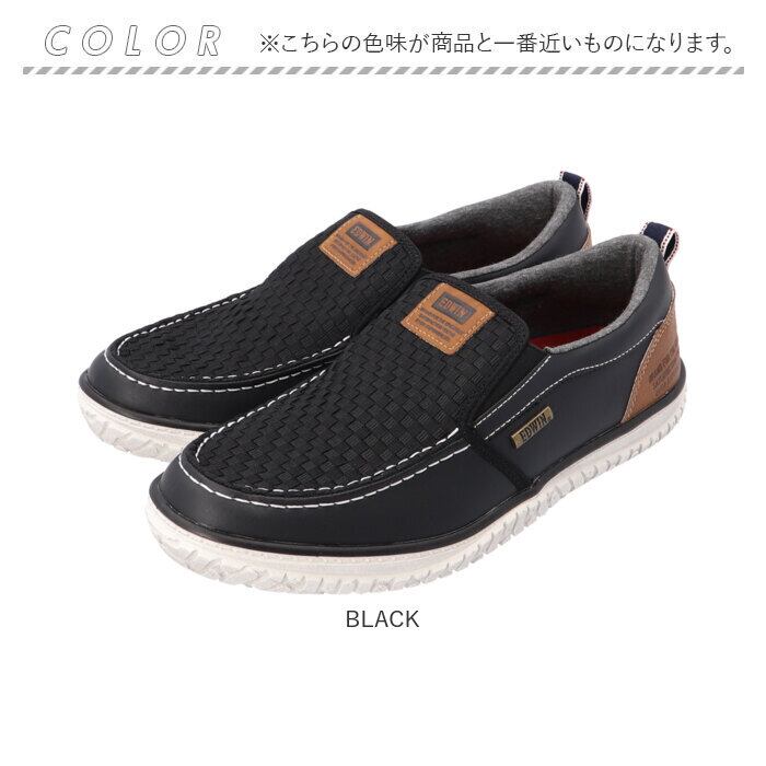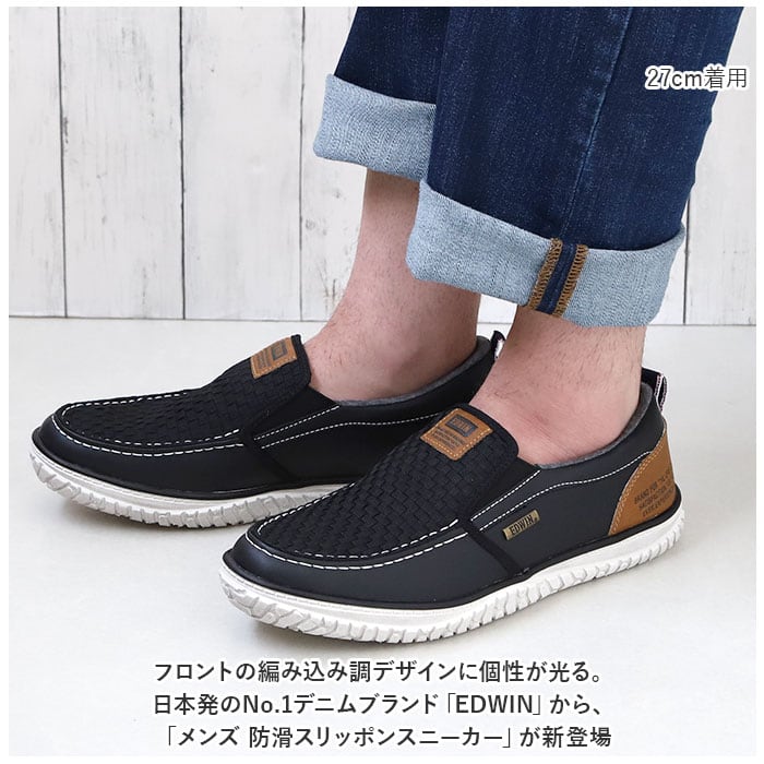・フロントの編み込み調デザインに個性が光る。日本発のNo.1デニムブランド「EDWIN」から、「メンズ 防滑スリッポンスニーカー」が新登場
