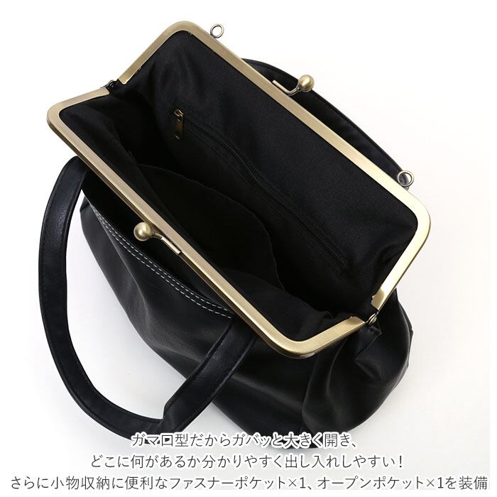 ・ガマ口型だからガバッと大きく開き、どこに何があるか分かりやすく出し入れしやすい!ひとつひとつ手作業で仕上げた、丁寧なつくりもポイント。